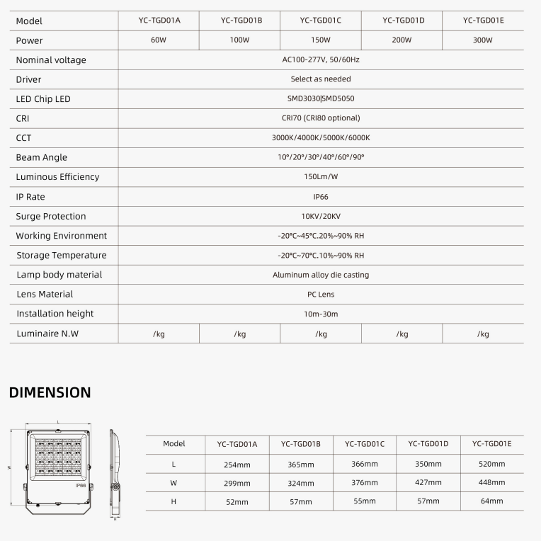 | YC-TGD01-50W | 358*294*52 | 50w | Heat sink Aluminum body,Glass,Bracket,304 screws, PCB, LEĆA. |