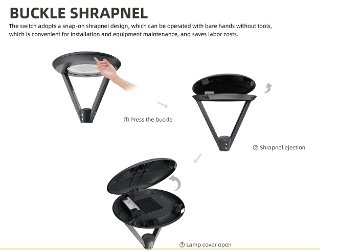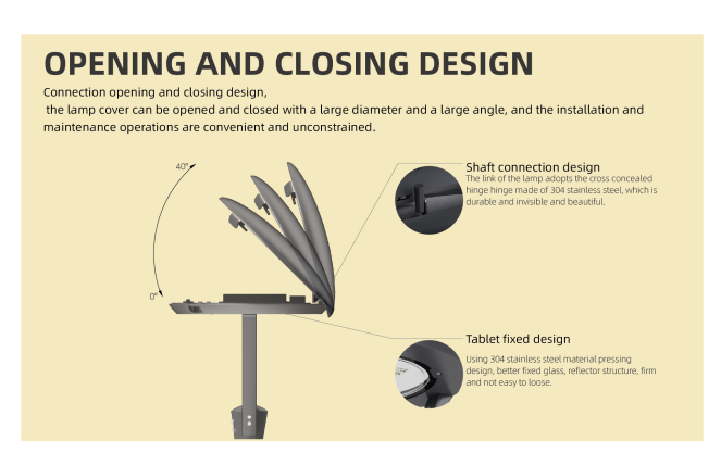 Dizajn otvaranja i zatvaranja priključka, poklopac lampe se može otvoriti i zatvoriti pod velikim uglom,